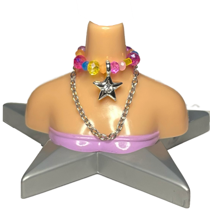 These beautiful California Cool Sets of are created to fit the Bratz 2001 Body sculpt, with extenders attached to fit any doll with a neck smaller than RH. The pendant may be subject to tarnish over time, so be sure to keep it clean and store it properly. Applying the chokers requires tweezers or a thread. Get yours today and make your doll the envy of all her friends!